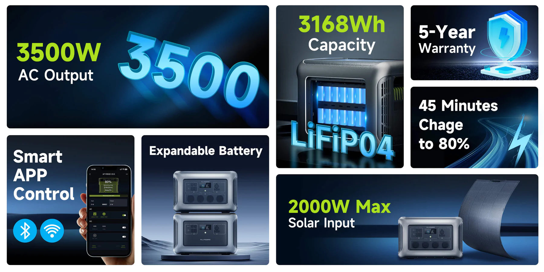 - Maximum 2000W solar charge in 2.5 hours;
