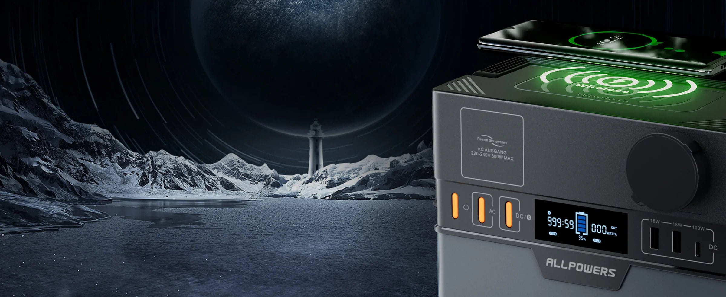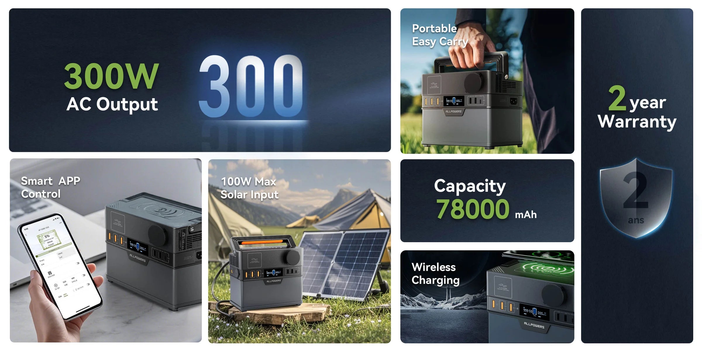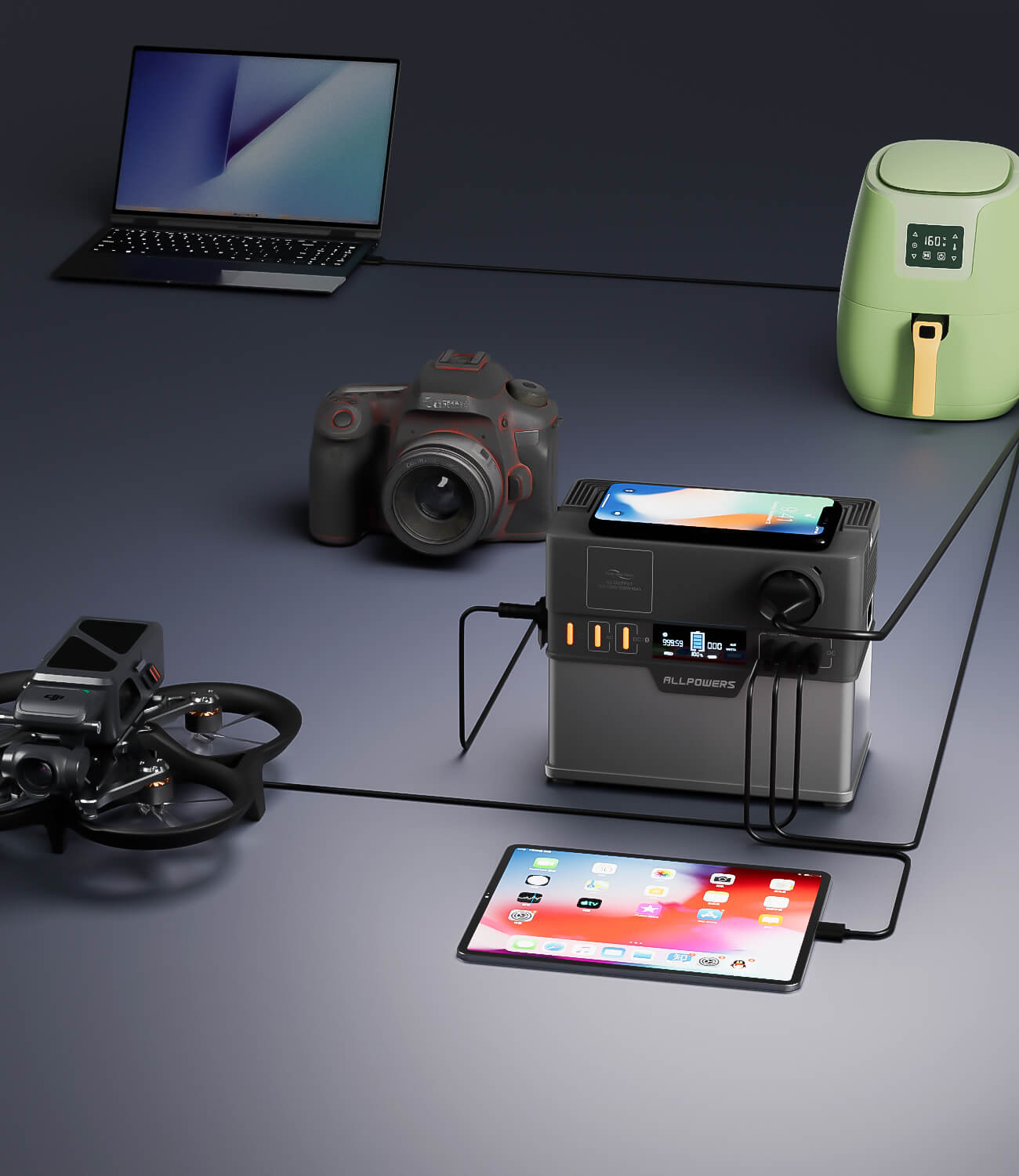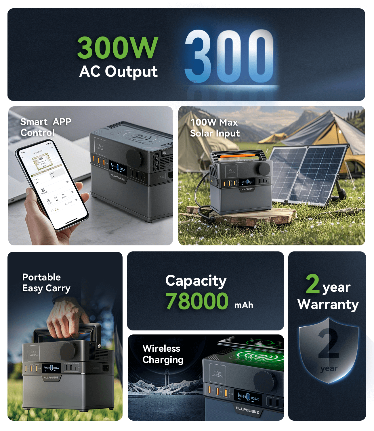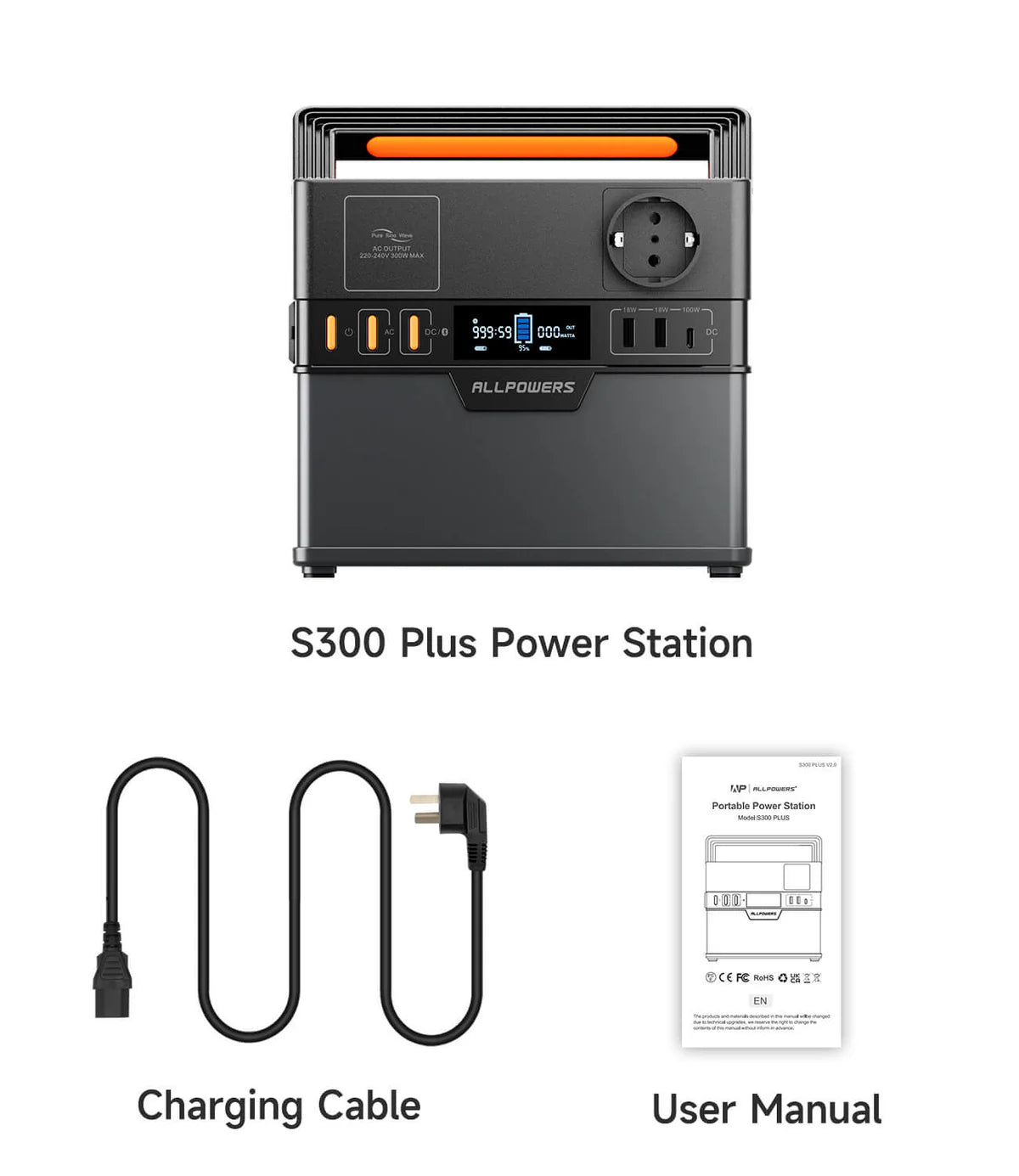 ALLPOWERS S300 Plus portable power station is equipped with a 288 watt-hour battery pack. Portable power source features 1*AC ports (220V-240v), 300W(peak 600w),2*USB-A ports,1*, 1*USB-C ports ,1*Cigarette lighter socket(12V/8.5A) and a wireless charger(5V/1A) at the top. Allpowers portable power station gives you the ports you need to charge all of your devices at the same time.