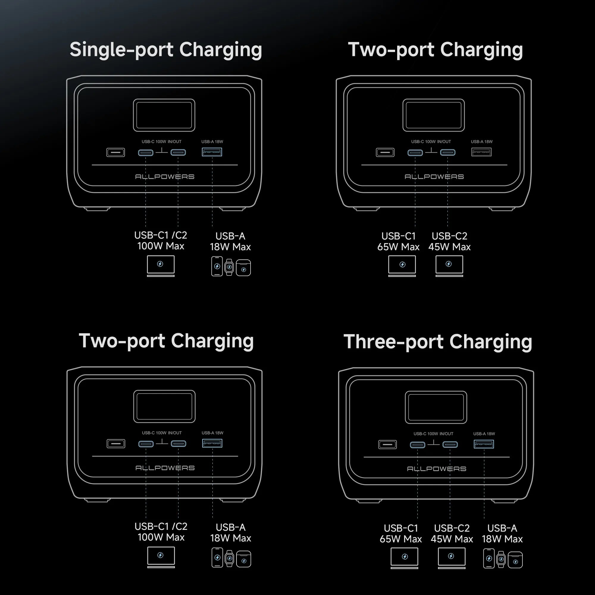 USB-C1/USB-C2 +USB-A Output: 100W+18W,Max 118W