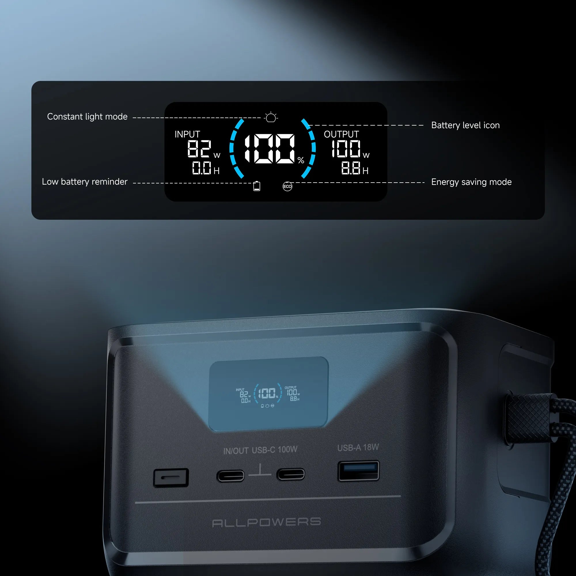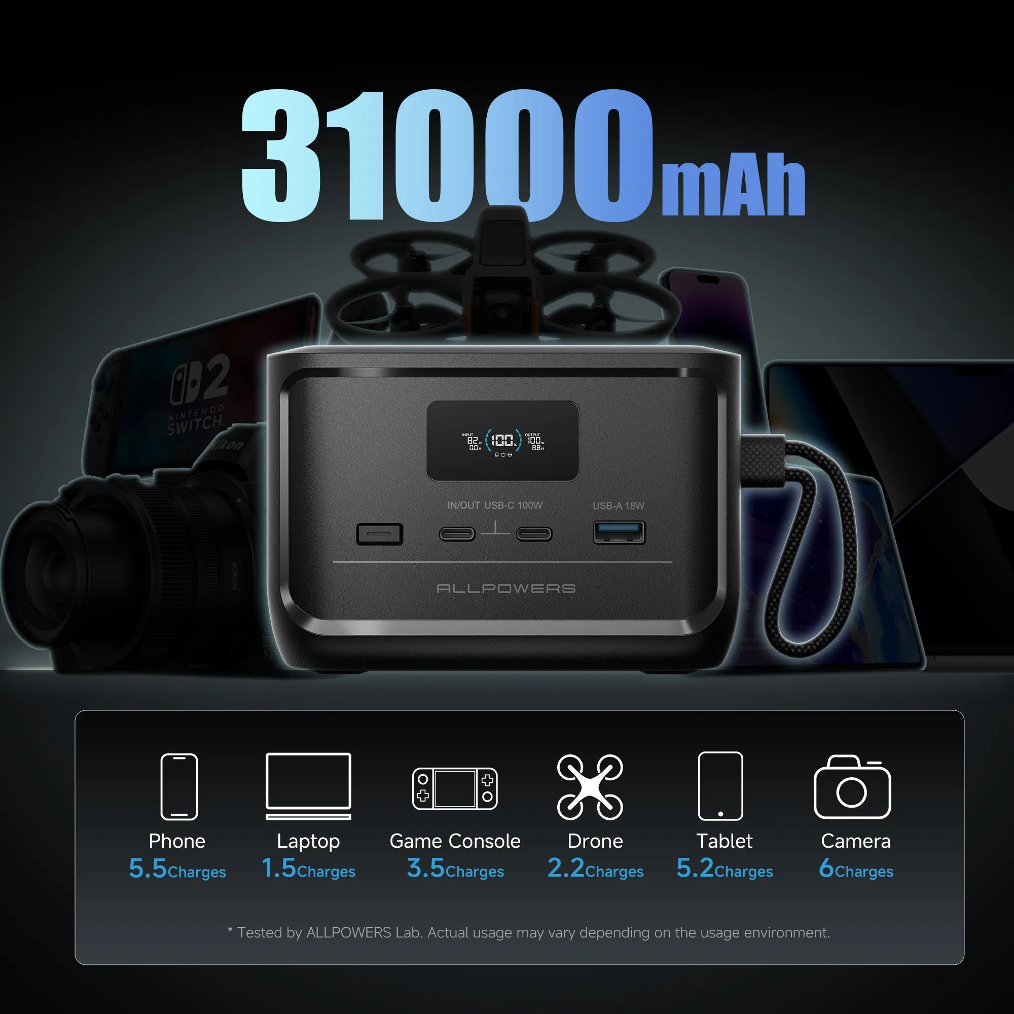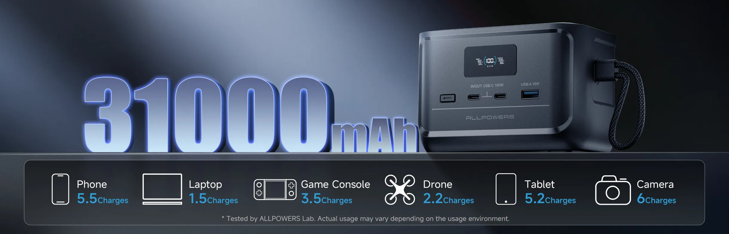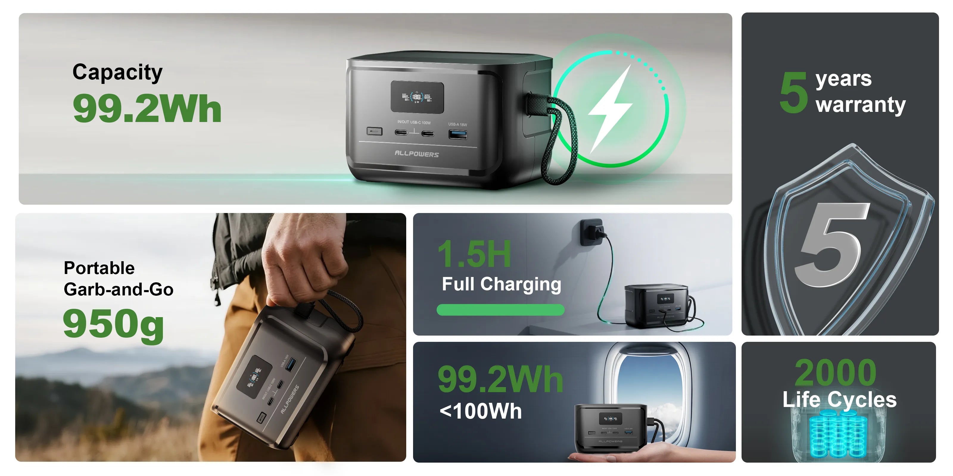 ALLPOWERS P100 showcase: 99Wh (31000mAh) LiFePO4 cell, dual 100W USB-C and 18W USB-A, AC/solar 100W input. Portable, durable and ideal for camping and emergencies.