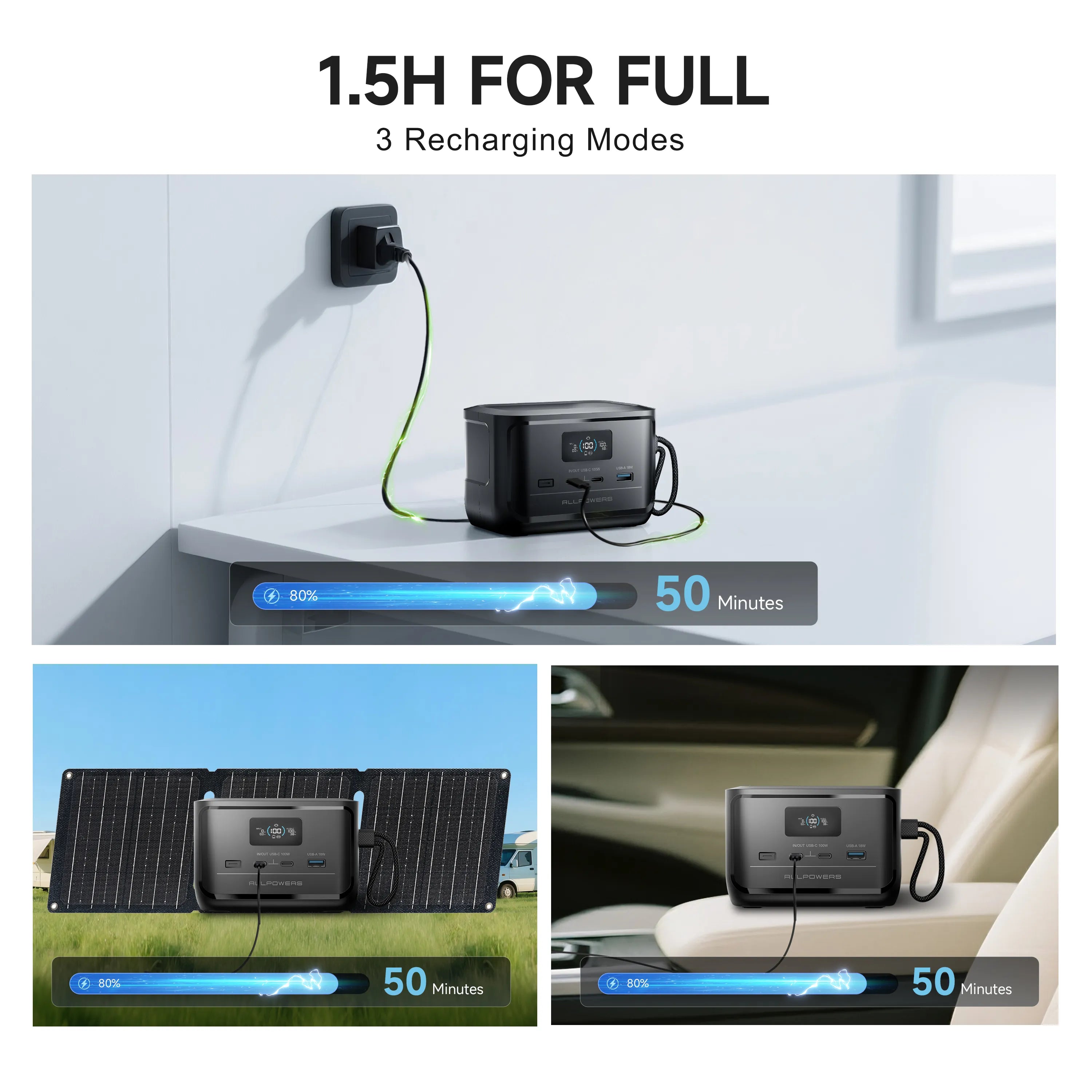 Versatile & rapid recharging for your Irish lifestyle. The Allpowers P100 boasts 3 flexible charging modes: super-fast 100W AC input (full in ~1.5Hrs), 100W Solar input, or slower via 18W USB-C. Need a quick boost? Get up to 80% power in just 50 minutes* with AC! The reliable LiFePO4 battery ensures long-term performance. *Under specific conditions.