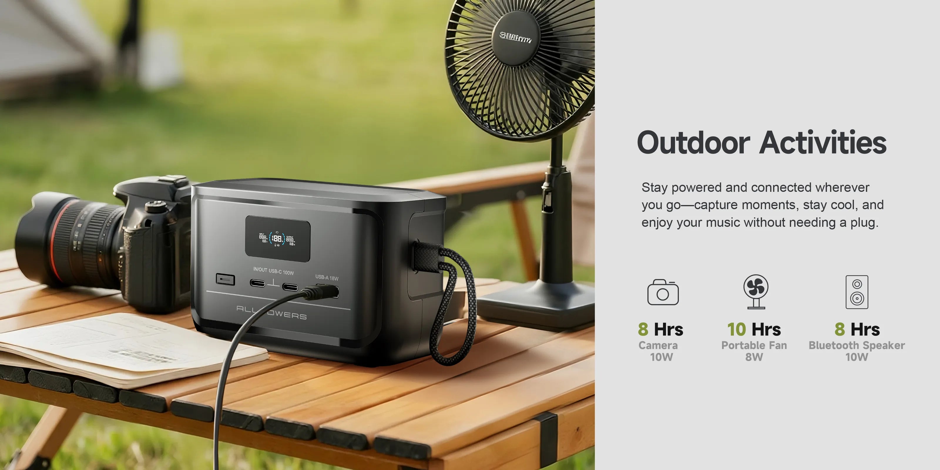 In outdoor demos the P100 reliably powers cameras, portable fans and Bluetooth speakers thanks to its 99Wh (31000mAh) LiFePO4 chemistry. Dual 100W outputs let you run high-draw devices concurrently, and AC or solar 100W input options extend runtime for extended shoots or multi-day trips—ideal for photographers, campers and creators. Keywords: outdoor power, camping, camera power.