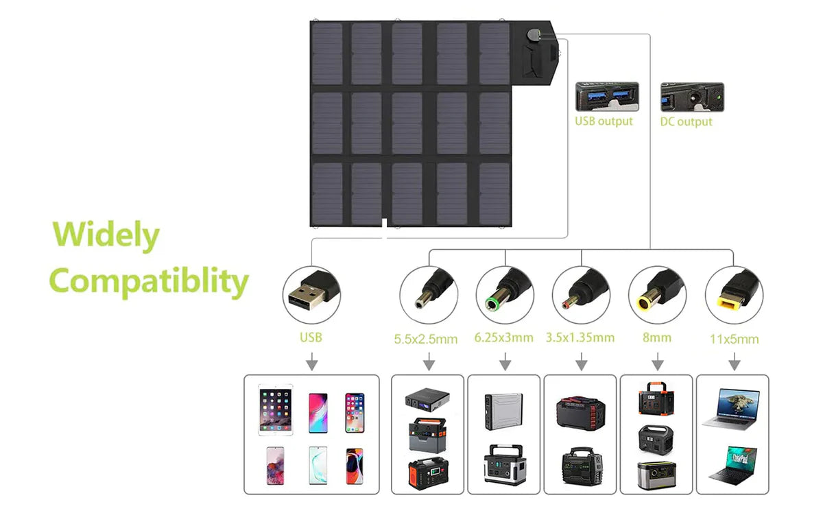 Equipped with the Dual USB Output, 100W solar panel is highly compatible with phones,ipads and other devices.You also could connect the ALLPOWERS S200/S300/S700 poratble power station.