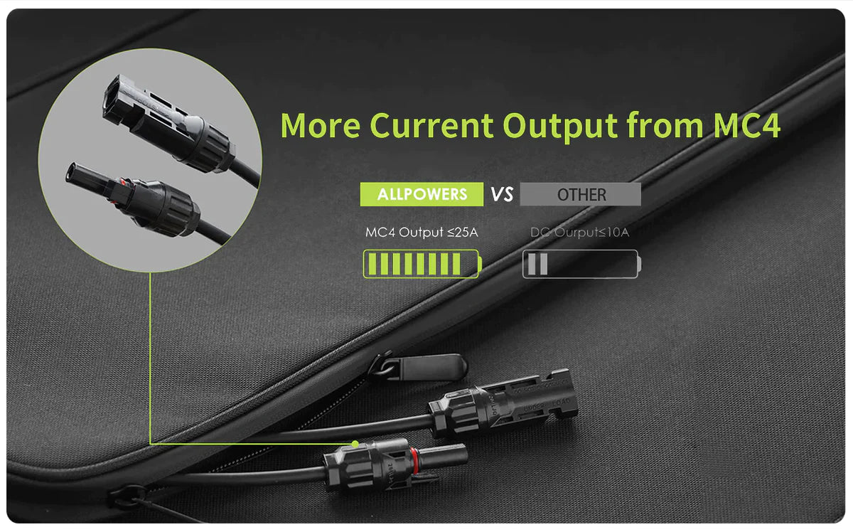 ALLPOWERS 200W portable solar panel up to 22% efficiency and 1/3 lighter than the same power of solar silicon. 200W Output can provide more power to your devices and charge it faster.