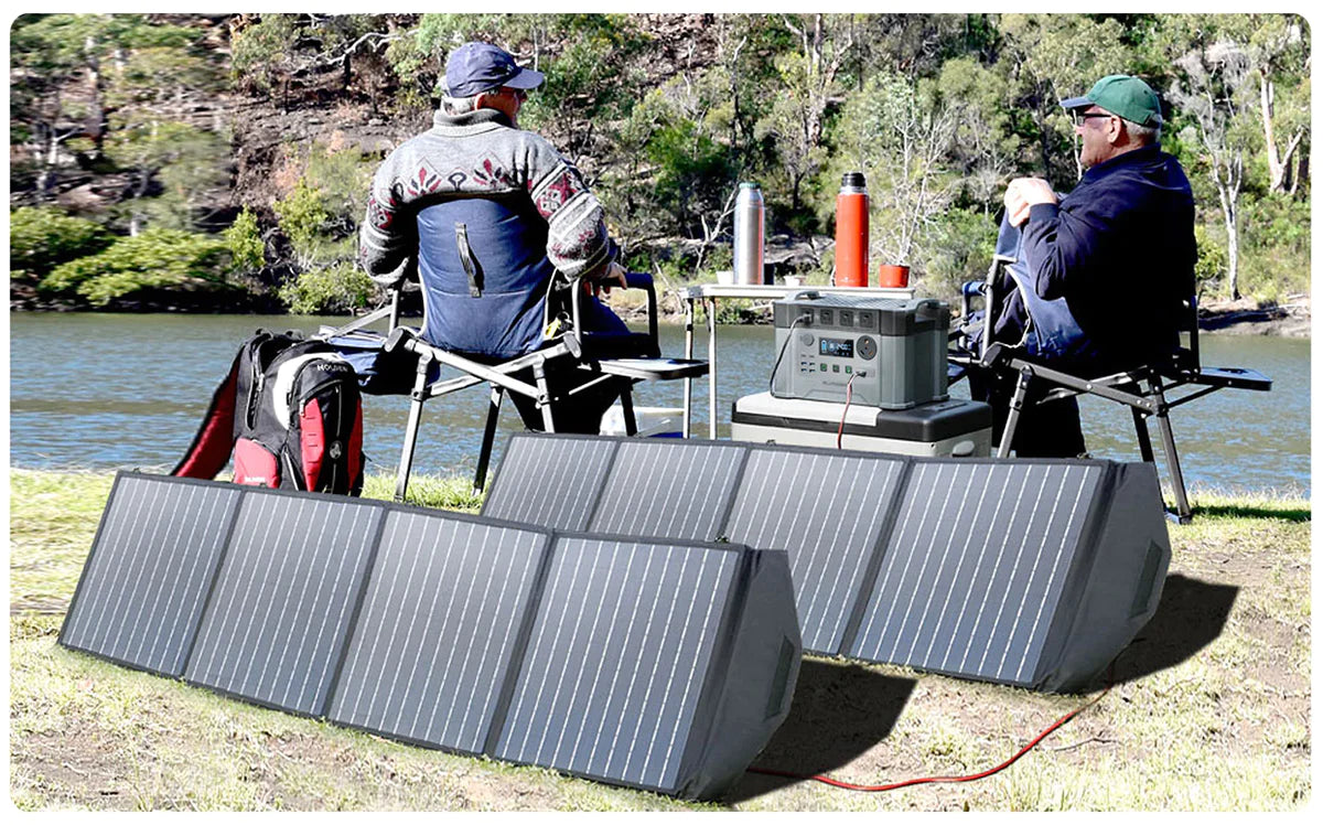 The foldable solar panel 200W constructed with durable and waterproof IP66 nylon and adjustable bracket. It can help your devices receive the most effective sunlight safely.