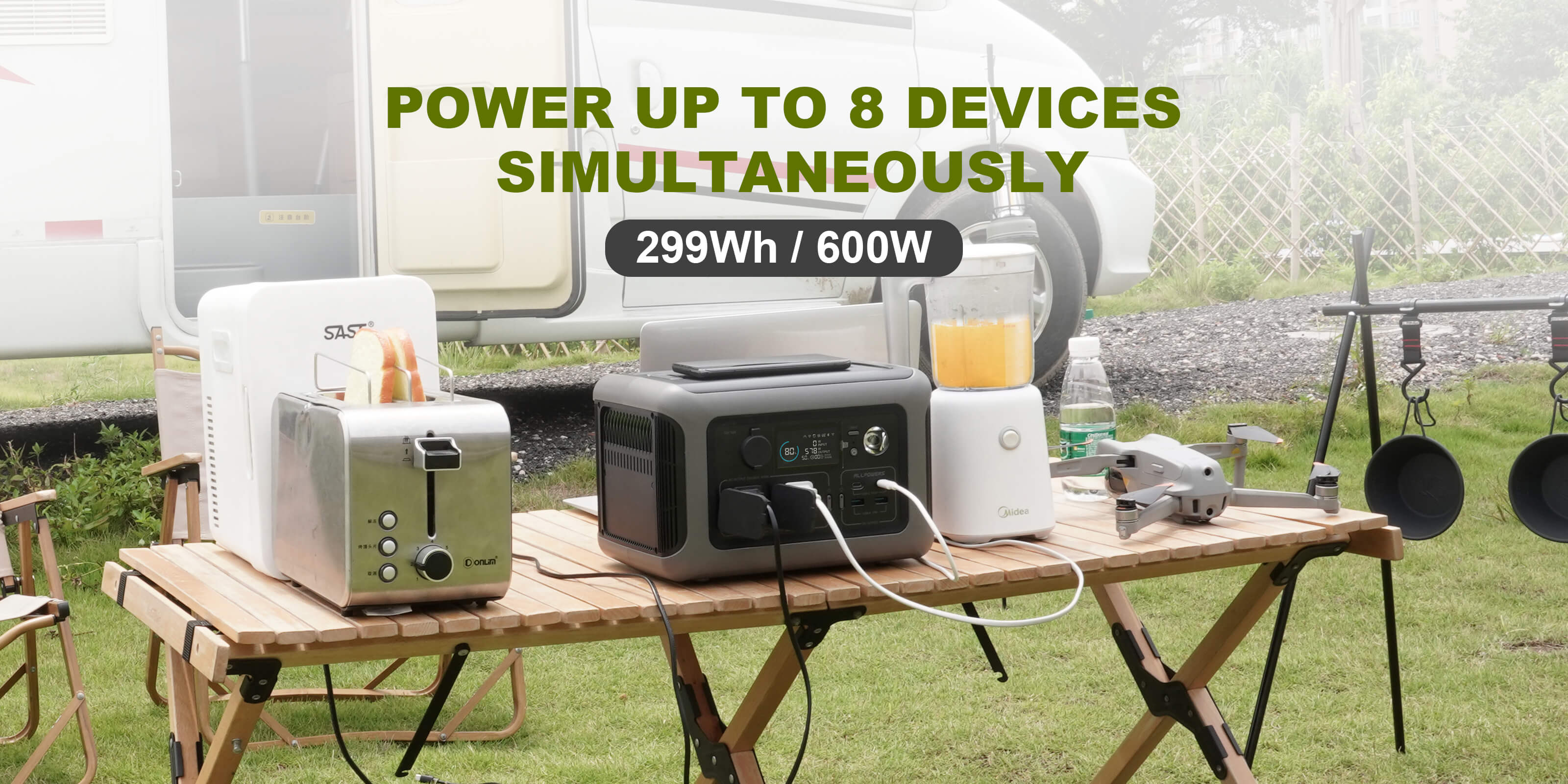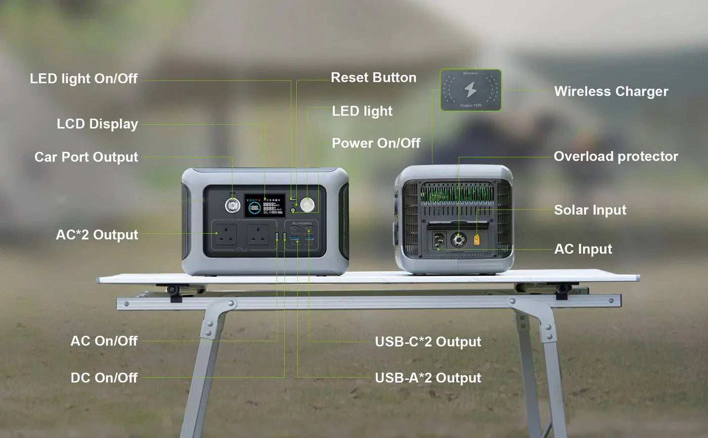 ALLPOWERS portable power station features 2* AC outlets (220V-240v 600W, 1200W Peak), 2 * USB-C ports, 2* USB-A ports and , 1* car cigarette lighter (12V/10A) and a 15W wireless charger . With an output of up to 600W, ALLPOWERS R600 outdoor generator is specially designed for charging kettle, juice, laptops, car refrigerator, drone and other outdoor electronics, power your outdoor adventure without worry.