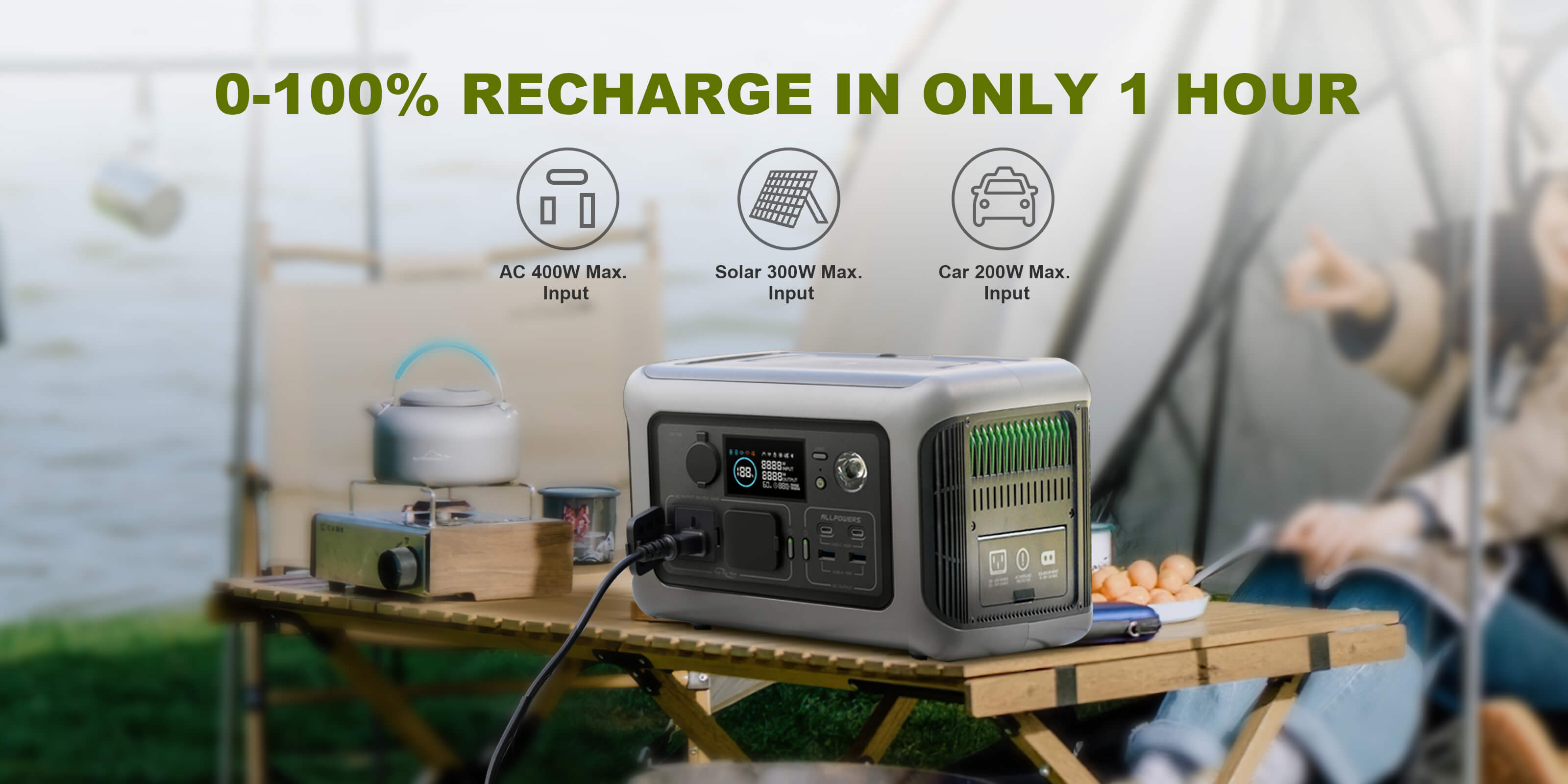 Fully recharge the portable power station with AC wall outlet in only 1 hour with ALLPOWERS fast charging technology, no bulky power brick, only a single cable to recharge R600 at most 400W max. Note: At present, some mobie phone may not be able to perform wireless charging due to the thickness of the camera.